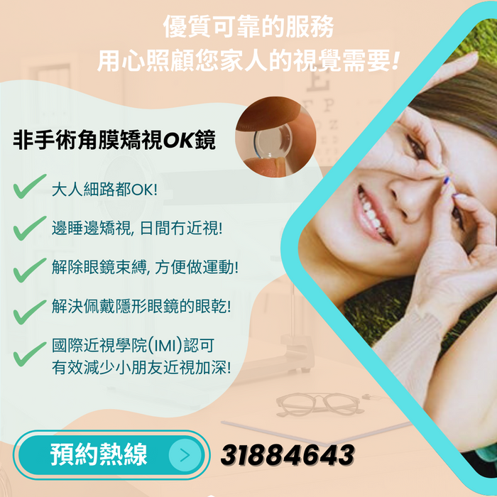 Orthokeratology 角膜矯形術/角膜矯視鏡(俗稱OK鏡), 其實係一個大人小朋友都合適嘅非手術, 可逆轉矯視方法, 幫您解除眼鏡束縛, 人都自信啲, 踢波, 游水, 學習都醒神啲! 據說古代中國嘅文獻亦有描述過OK鏡嘅概念, 述說士兵在晚上睡覺時用沙袋壓住眼睛, 第二日就會睇遠清晰啲, 射箭準啲!! 基本上近視度數少於700 (-7D), 散光度數少於300 (-3D) 人士都可以考慮佩戴OK鏡, 亦都適合因為特別眼睛狀況 (例如角膜太薄)不能做激光角膜矯視, 又或者佩戴隱形眼鏡有眼乾狀況的人士 近年國際間嘅近視研究亦確認OK鏡能有效控制小朋友近視, 減少加深, 長遠降低青光眼, 黃斑病風險! 而且長大後近視唔深的話, 激光矯視手術都或者唔使 都真係幾OK㗎! iCare Eyecare 護眼.家由博士視光師Dr Marco監督整個OK鏡驗配評估程序, 採用嘅鏡片來自美國, 澳洲, 荷蘭, 日本, 確保鏡片適合有效, 佩戴者眼睛長久保持健康! 首年OK鏡近視控制療程, 包括一對訂製合適的鏡片及不限次數的近視控制及眼睛健康跟進檢查, 收費為$13,000 起; 次年更換OK鏡, 包括12個月內跟進檢查, 收費為$7,800 起 擔心佩戴過後, 先發覺唔適合? 放心, 我哋亦都有合理嘅退款方案, 詳情可以喺落實鏡片療程之前向我哋職員查詢, 清楚明白先至落實療程!